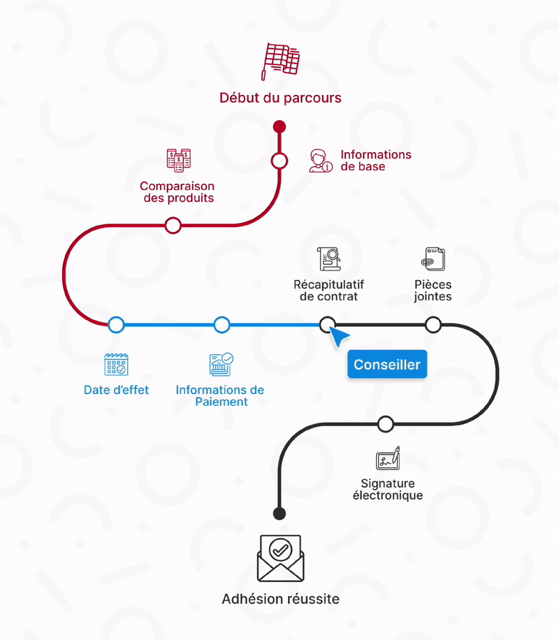 Avec l’omnicanalité, le conseiller peut compléter le parcours lancé par un prospect en temps réel et à partir de l’étape où le prospect s’est arrêté, idem pour le prospect qui peut compléter un projet lancer par un conseiller, chacun dans son espace dédié.